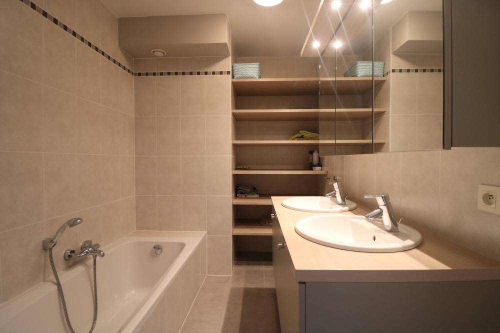 - 1 salle de bain avec double vasque et baignoire ;