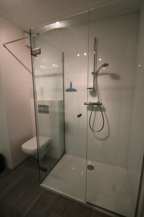 - salle de bains luxueuse avec douche, machine à laver et machine à sécher;
