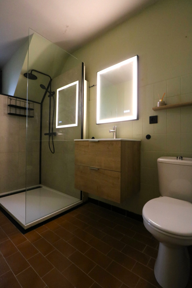 - moderne badkamer met inloopdouche en aansluiting voor wasmachine.