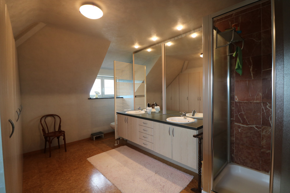 - zeer ruime badkamer met ingemaakte kasten, groot badkamermeubel, douche en tweede toilet;