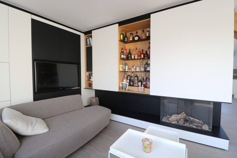 - zeer ruime, lichtrijke leefruimte met ingemaakte gashaard, barmeubel en bureau;