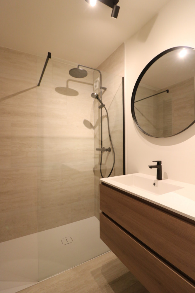- luxueuze badkamer (Travertin tegels) met ruime inloopdouche en handdoekradiator;